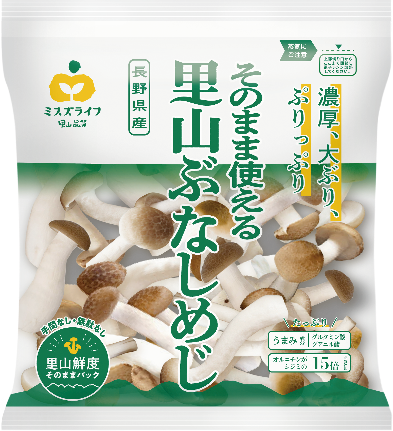 1991(平成3)年、長野県に創業。生鮮カットぶなしめじ『そのまま使える里山ぶなしめじ』、『冷凍カットぶなしめじ』、『ぶなクイーン』の生産・全国販売を行う。