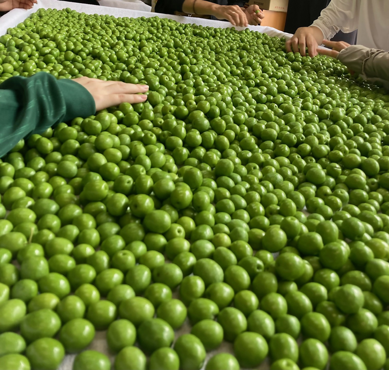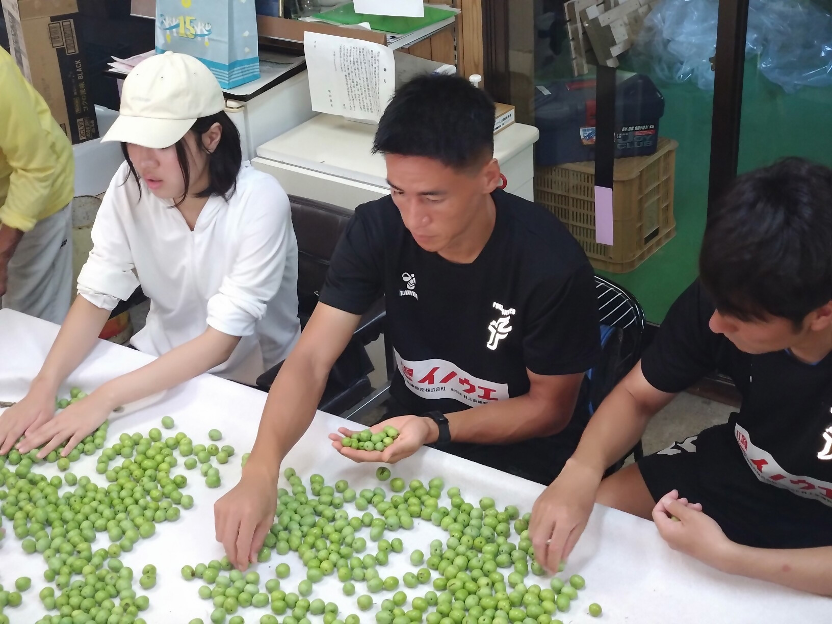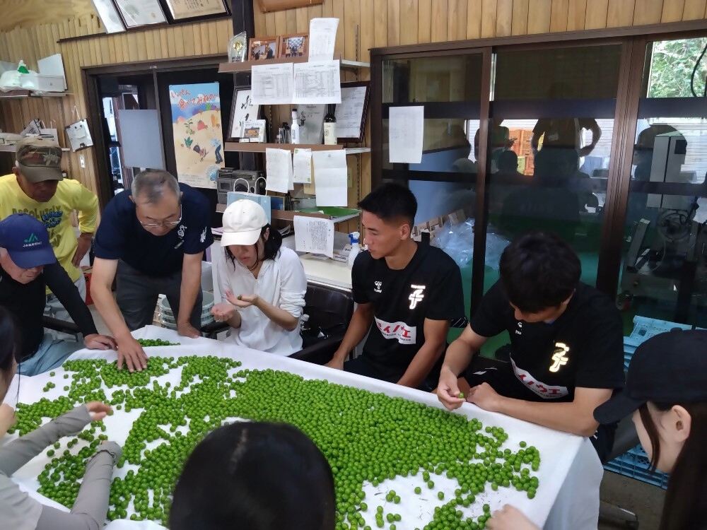 収獲初日には、共立女子大学の学生9名、福井県立大学の学生4名が午前中から収穫作業に参加。午後には福井ユナイテッドFCから、北川選手と北脇選手の2名が加わり、選別作業を体験しました。収穫されたオリーブは約1週間塩漬けされ、福井県内の道の駅や直売所にて販売される予定です。