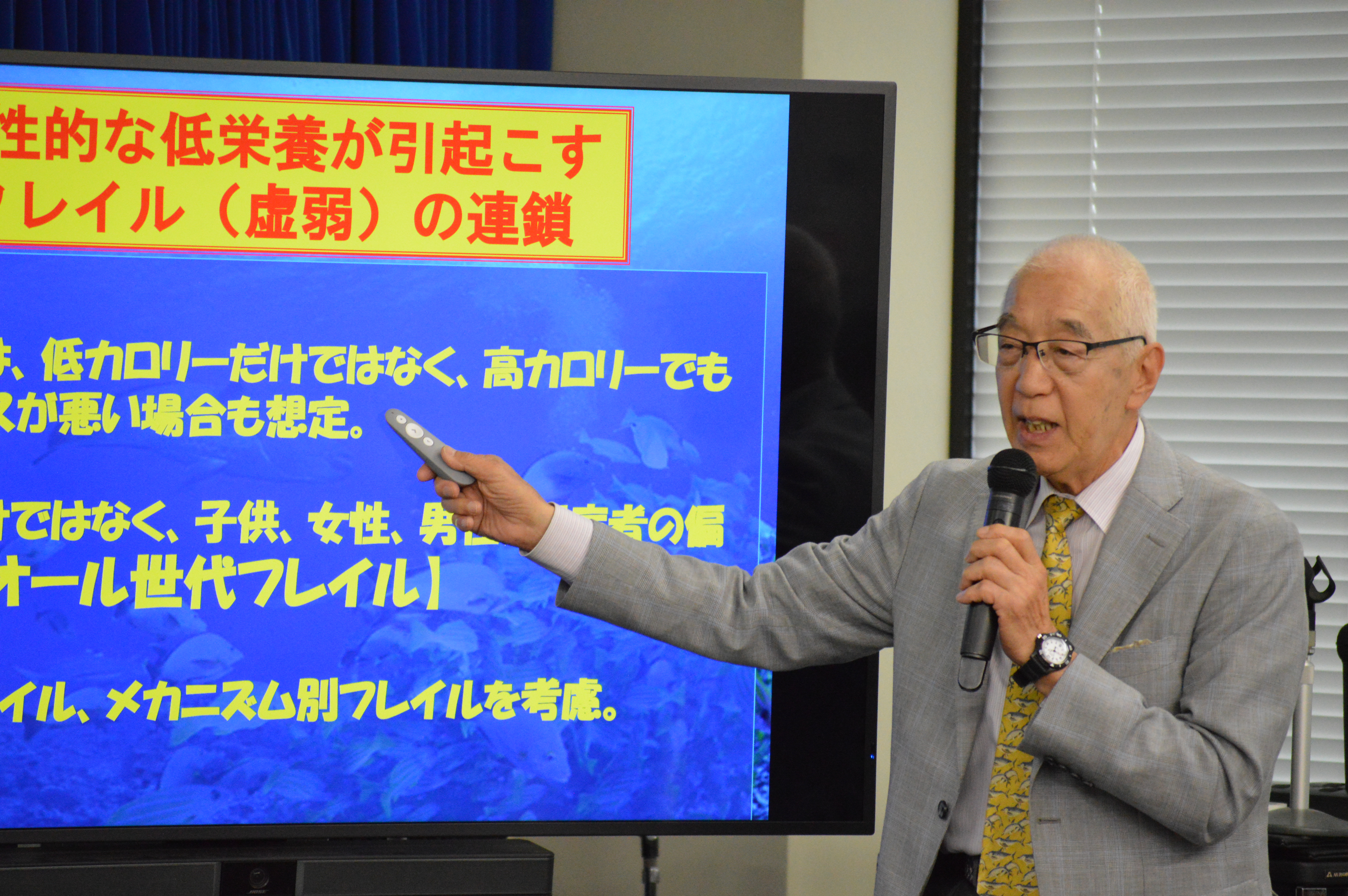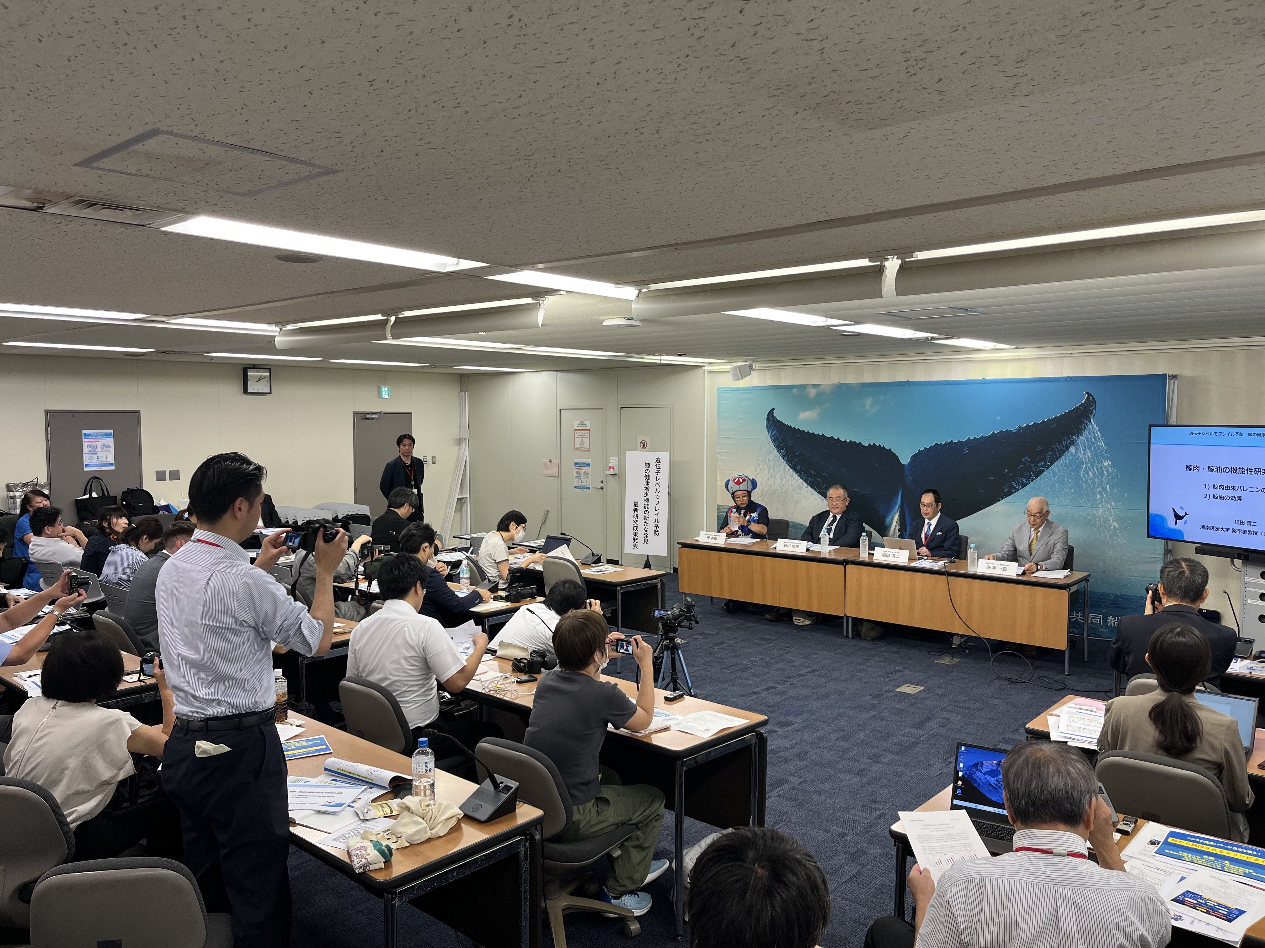 「若い世代では鯨を食べる文化は薄らいでいるが、鯨はどんどん食べていい。昔から鯨は高たんぱく、低カロリーで健康に良いといわれてきた。今日は健康に寄与する鯨の最新の研究成果を発信したい」と鯨の食品としての健康増進効果をアピールしました。