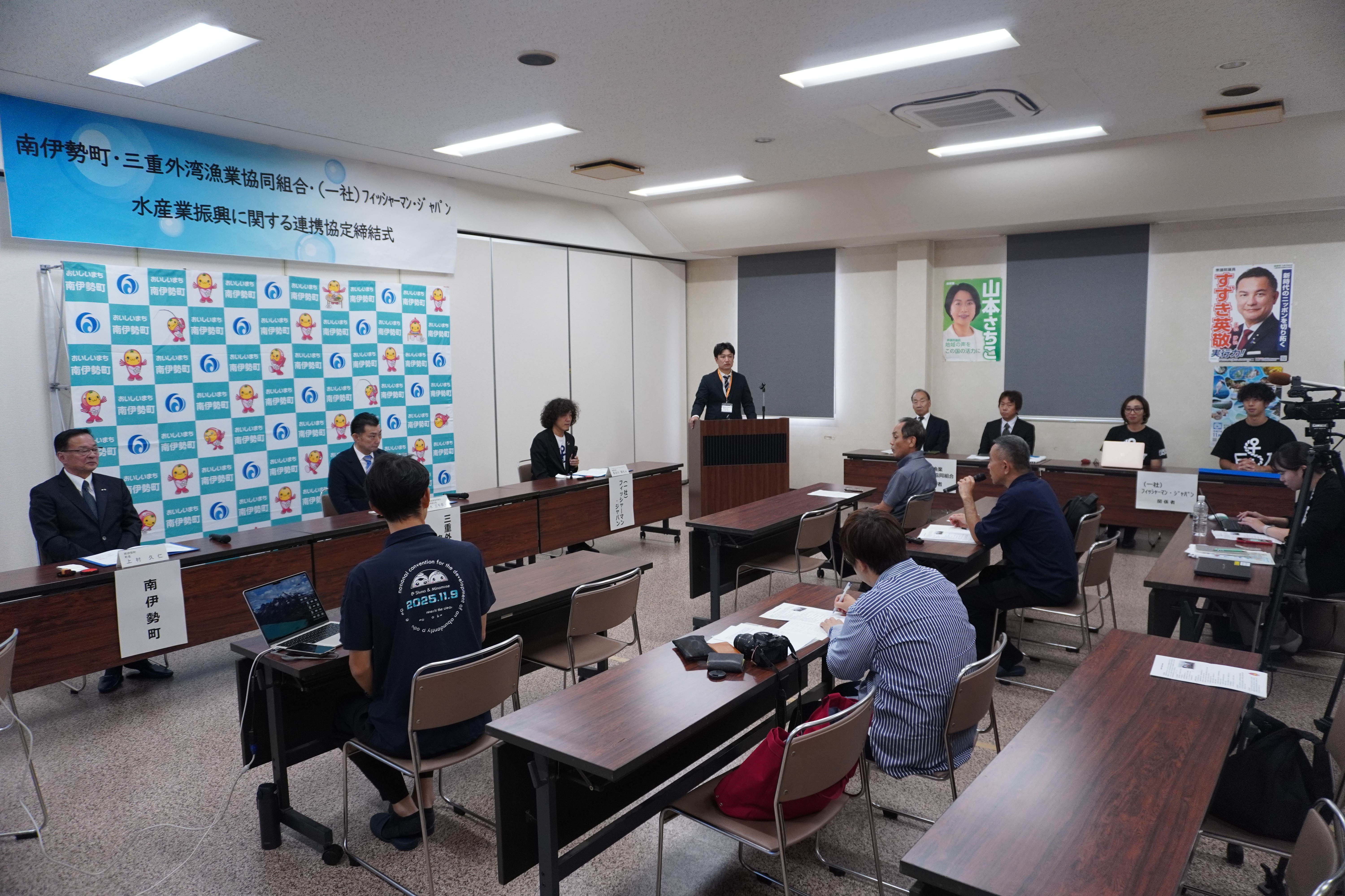 このたび、南伊勢町、三重外湾漁業協同組合(以下外湾漁協)、一般社団法人フィッシャーマン・ジャパン(代表:阿部勝太、宮城県石巻市、以下FJ)の3者は、活気ある水産業の実現に向けて連携協定を締結する運びとなりました。本協定では、これまで取り組んできた「担い手育成」をさらに発展させながら、「海業の振興」「デジタル化の推進」「藻場再生と新しい養殖技術の導入」の3つを柱に据え、持続可能な水産業と地域の未来を共に築いてまいります。