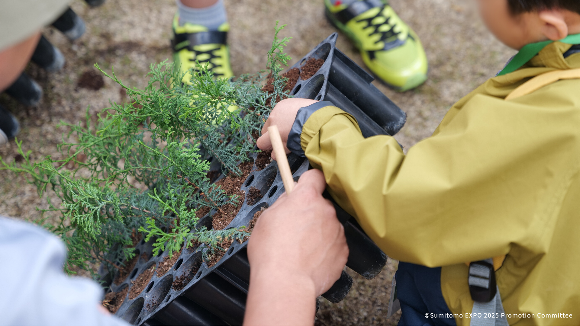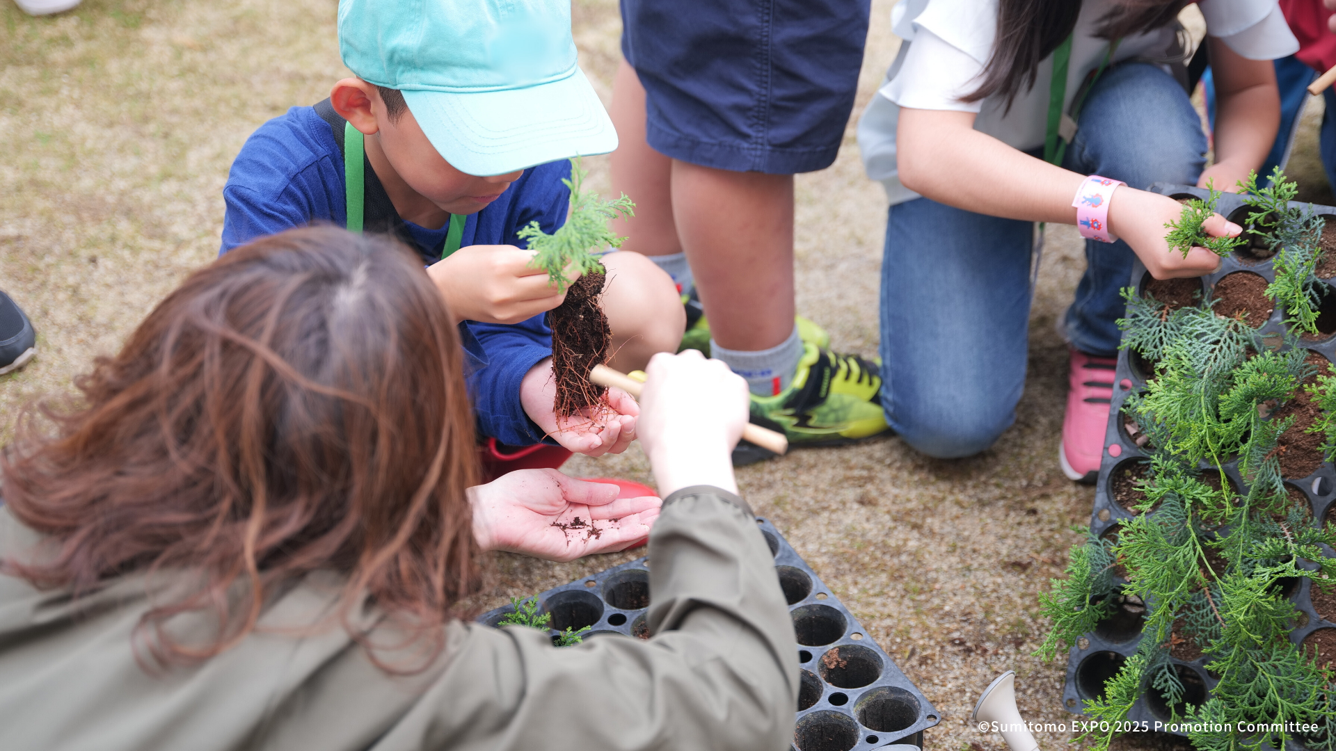 (参考)住友館の植林体験:https://sumitomoexpo.com/experience/plant_a_tree/