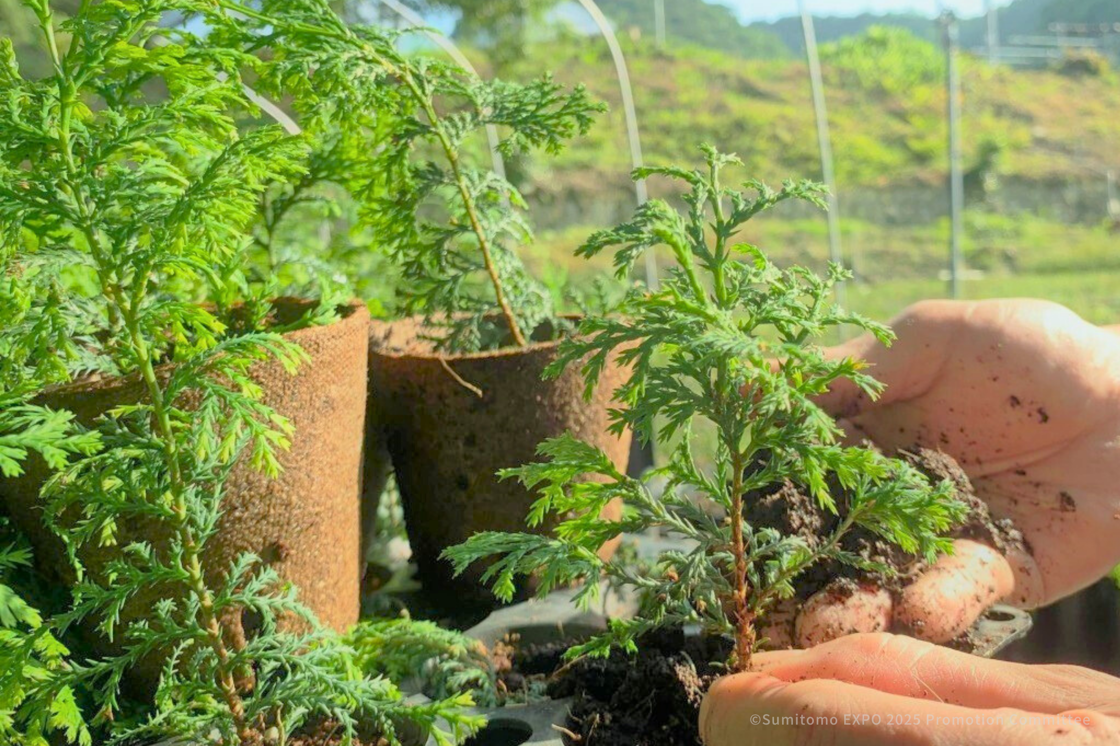 住友館に訪れた方々の手で植えられた苗木は、これから長い年月をかけて育ち、人々の想いと共に未来を支える森へと成長します。数十年後、数百年後、成長した森のいのちたちが次の世代に出会い、また次の未来へと託されていく。時と共に年輪を重ねるように、今回の住友館の植林体験が、やがて大きな希望の連鎖となっていくことを願っています。