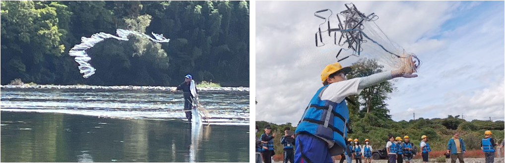 瀬張り網漁を行っている日置天治さんに、漁で使う自作の網を見せてもらい、網の投げ方やアユの捕らえ方を教えてもらいました。続いて、児童らは河川敷で網を投げる体験を行いました。多くのアユを捉えるには、網を狙った場所に広がるように投げる必要がありますが、実際に投げてみると、広げることはもちろん、思った場所に投げるのは至難の業。子どもたちは、漁には熟練の技が必要だと知りました。