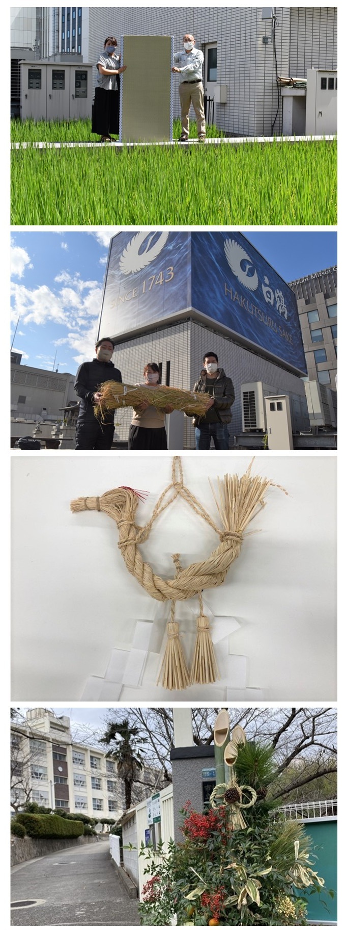 屋上仲間からご縁をいただき、都内の飲食店に差し上げ、魚や肉などの藁焼きの材料として活用していただきました。他にも鶴をモチーフとしたしめ飾りを作っていただきました。