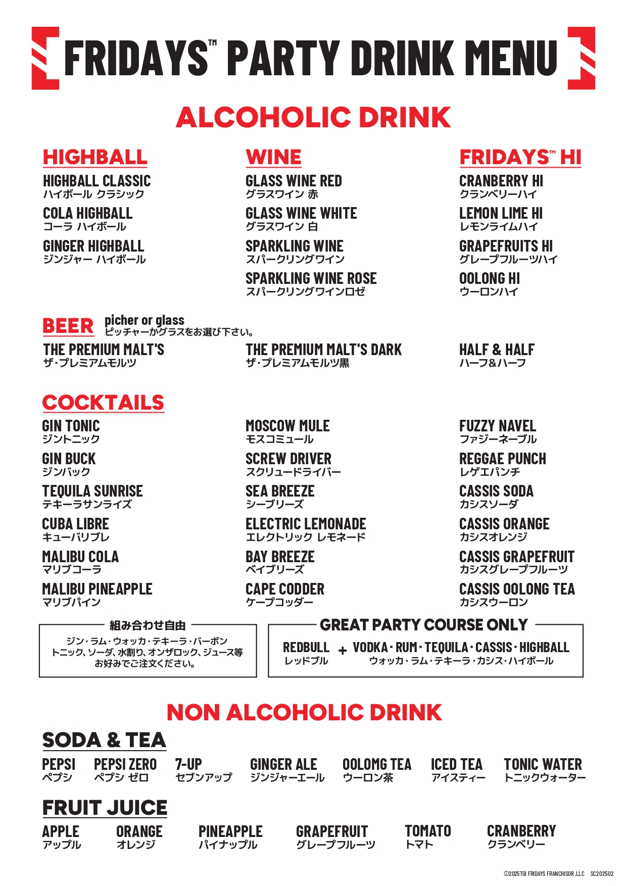 アメリカン料理の王道、大人から子供まで、大人気のバーガー、リブが入ったフライデーズを象徴する豪華なラインナップ。さらには、多種多彩なドリンク飲み放題メニューに、レッドブルが加わった グレイトなパーティーコースです!