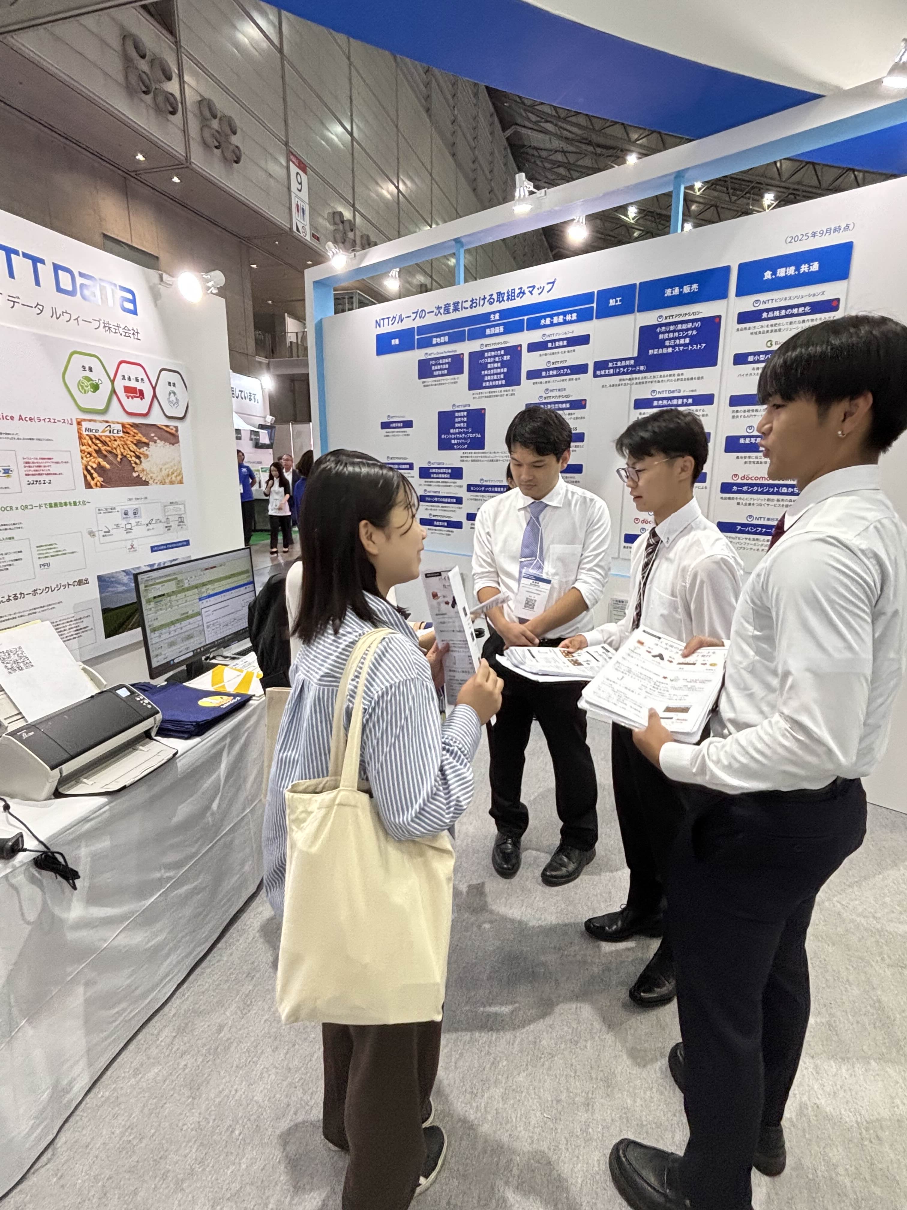 本展示会では、NTT社の連携企業として、NTTグループのブース内にて展示を行いました。弊社は農業分野における持続可能な取り組みとして、以下のソリューションを紹介いたしました。